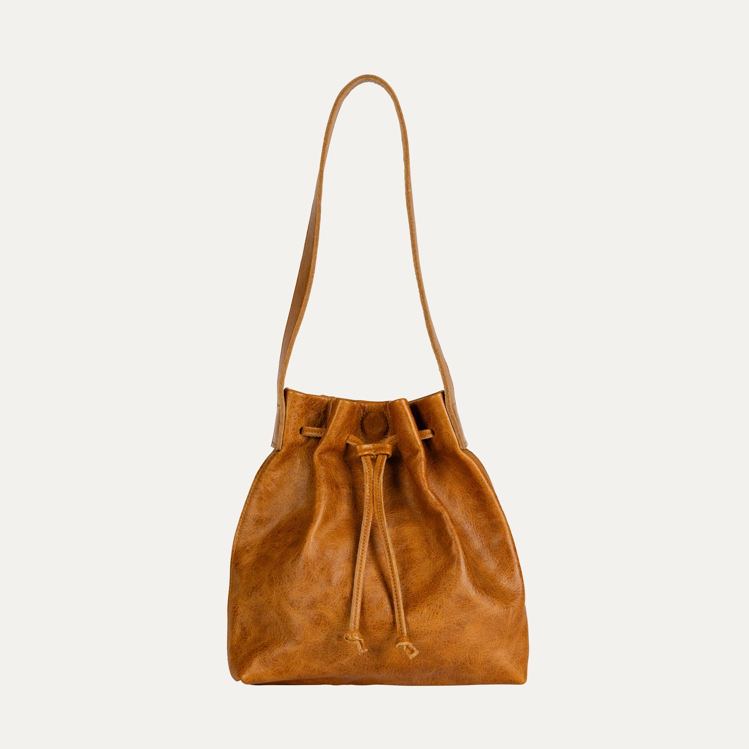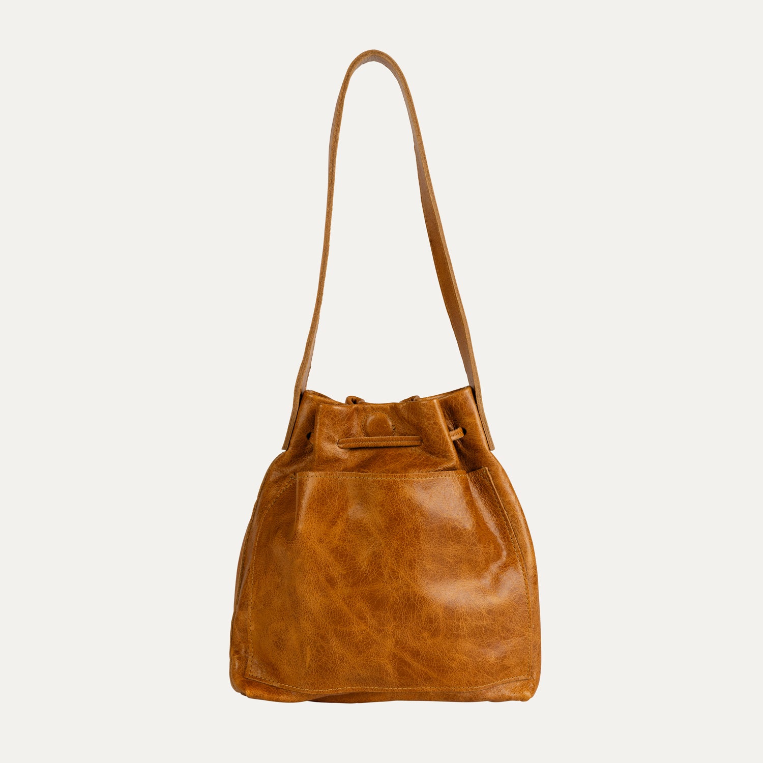 Cognac leather shoulder bag with leather draw string closure with magnetic snap and exterior phone pocket.