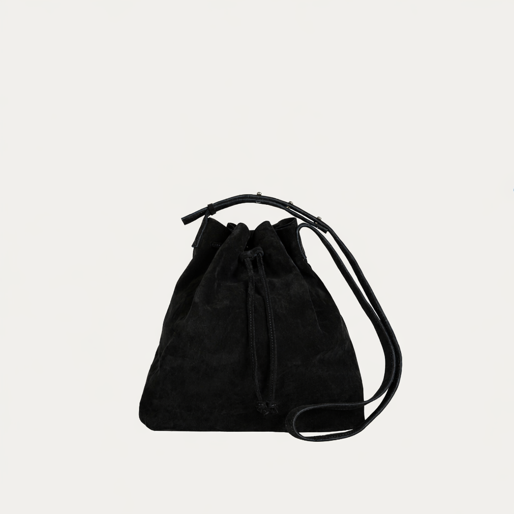 Black Suede Medium Crossbody Boho Bag with leather drawstring closure with adjustable strap & exterior phone pocket.