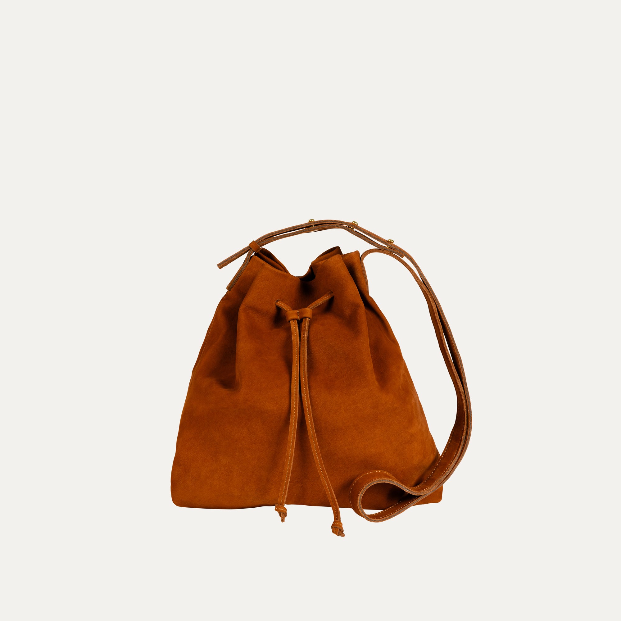 Cognac Suede Medium Crossbody Boho Bag with leather drawstring closure with adjustable strap & exterior phone pocket.